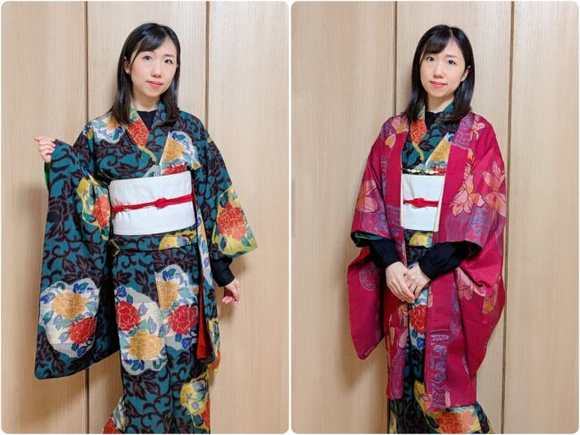 着物も羽織も、花林ちゃんから譲り受けた銘仙です。